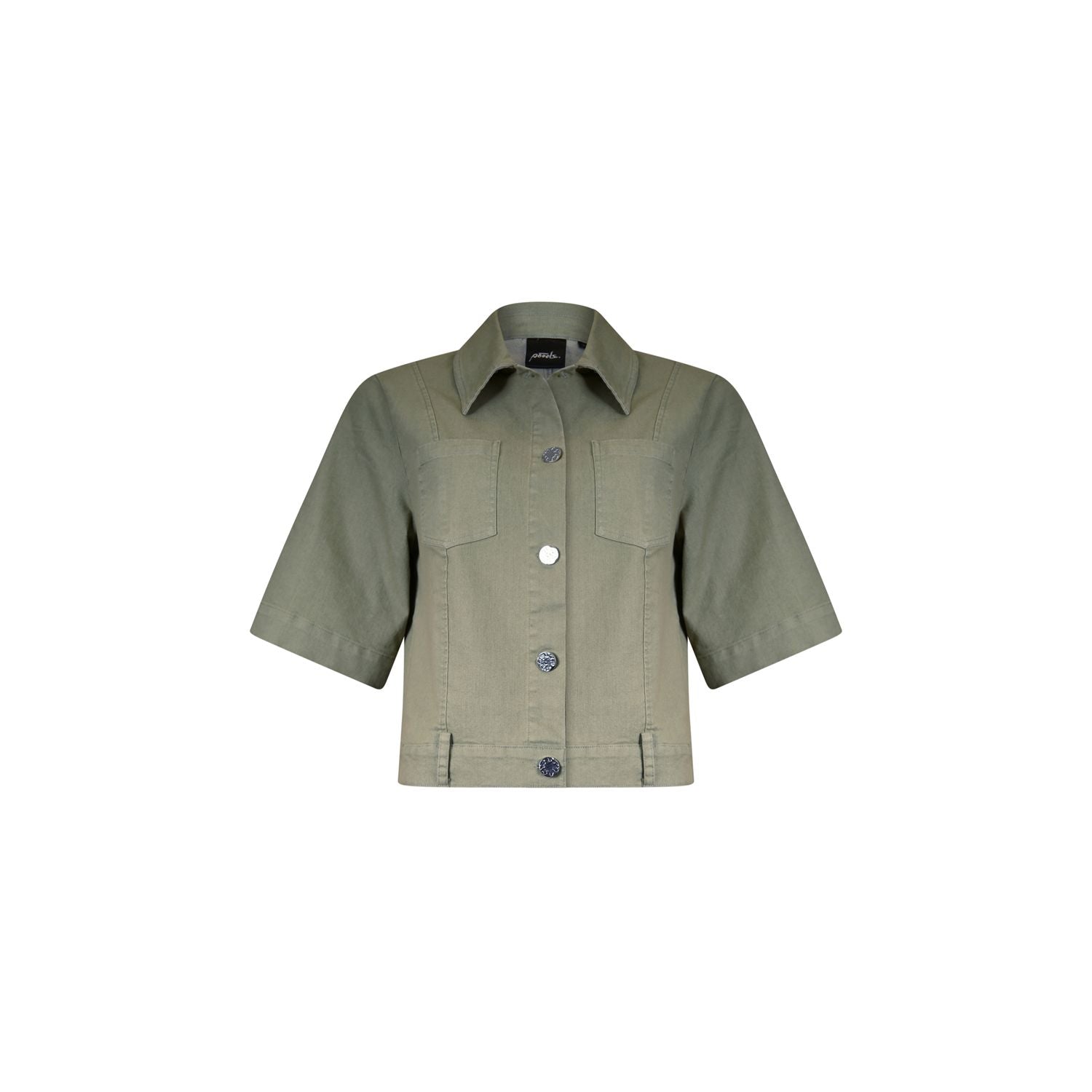 Getailleerd jeans jasje met korte mouw, kraag en zilveren knopen. Perfect te combineren met onze bijpassende broek of over je favoriete top.