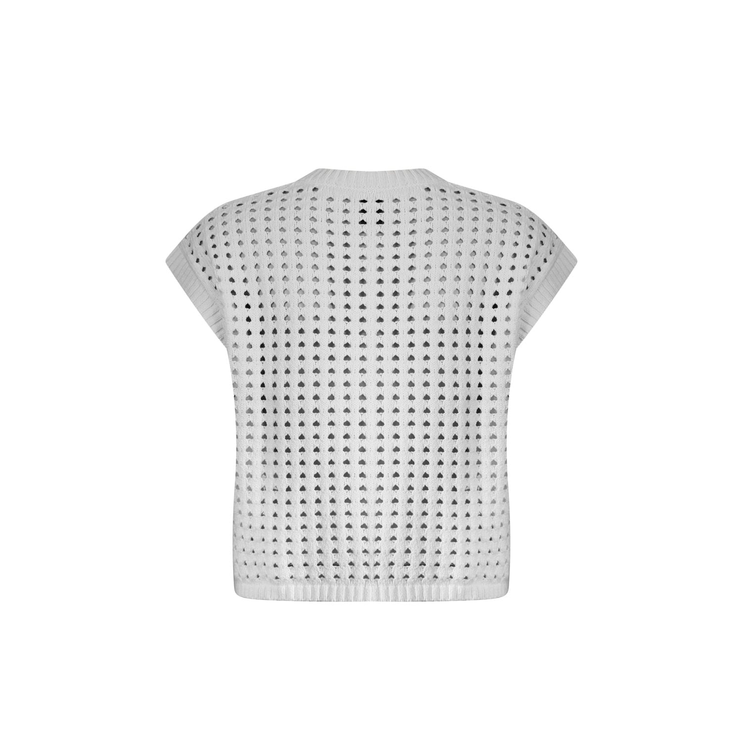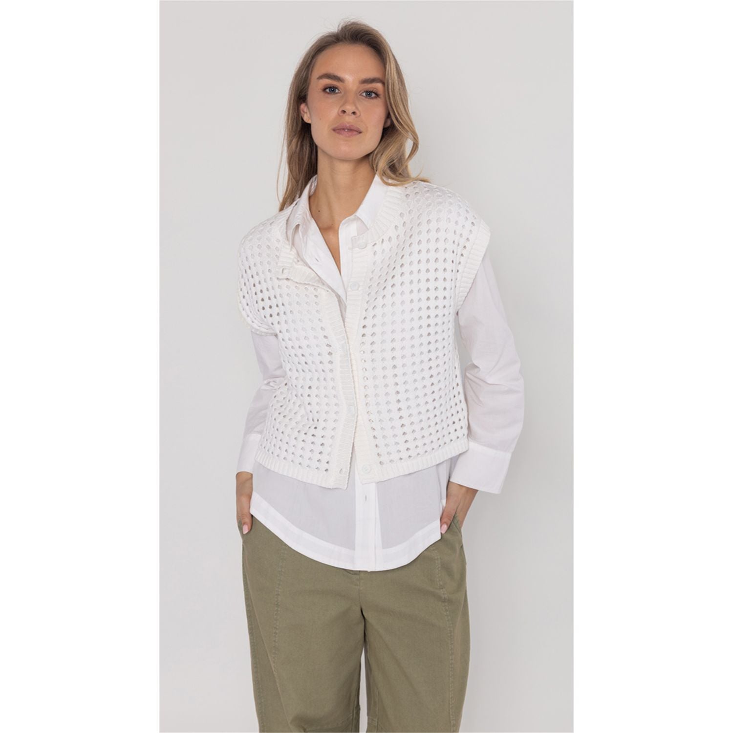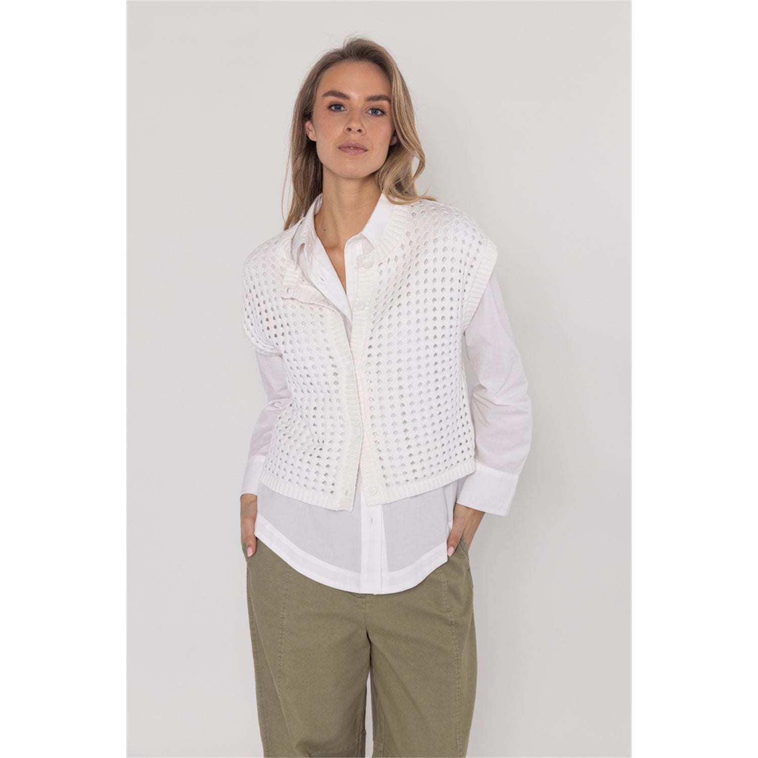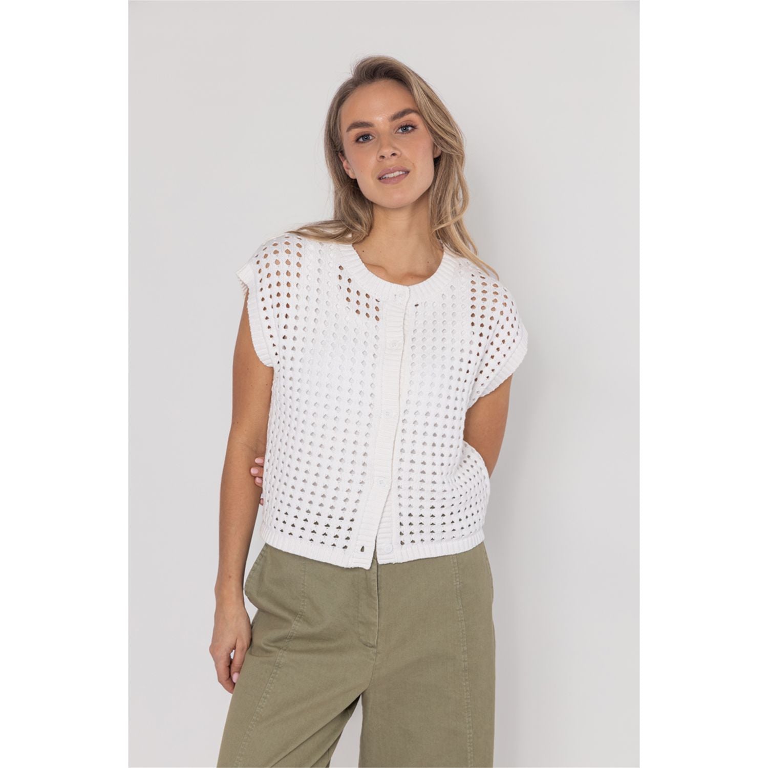 Cotton blend sleeveless cardigan with exposed stitch, boxy fit and button closure. Wear over a blouse or as a top on warm days.