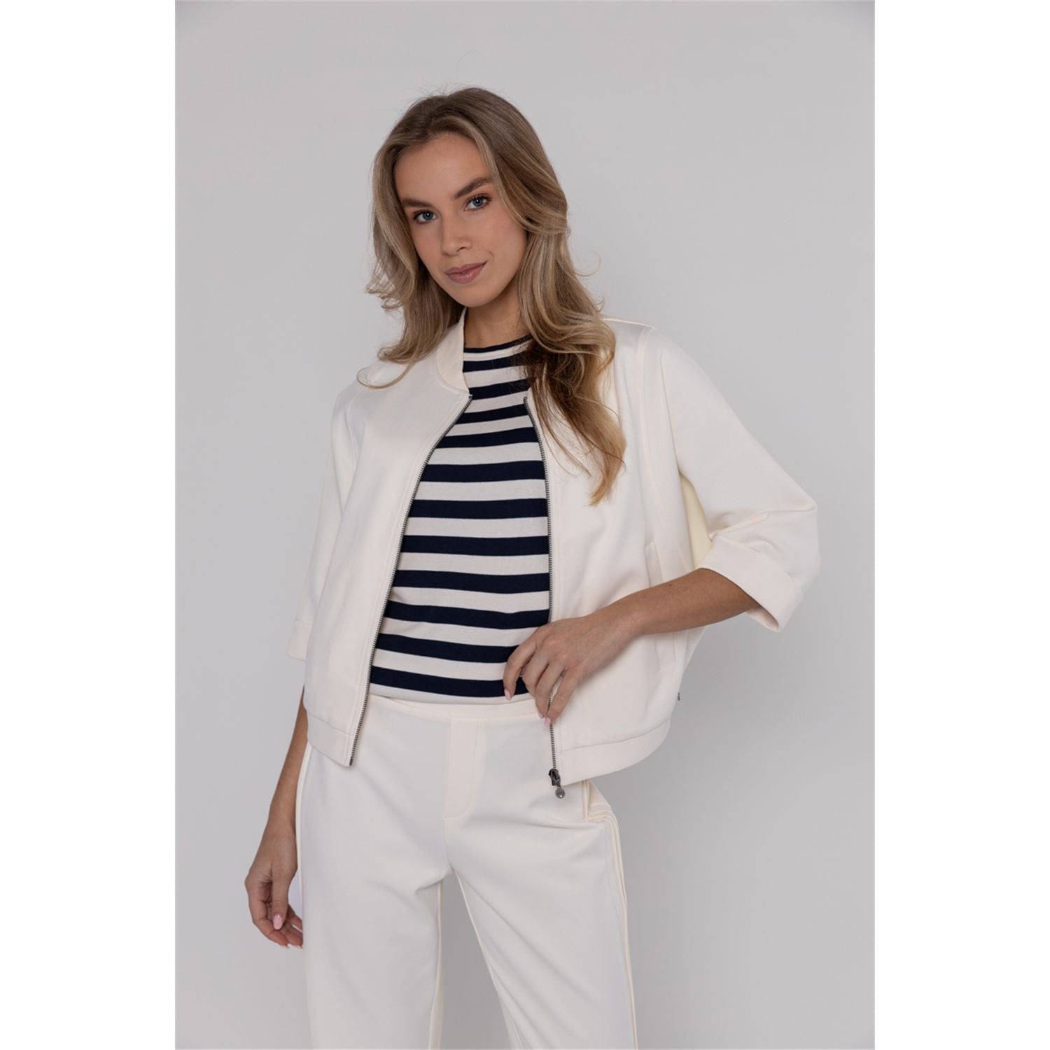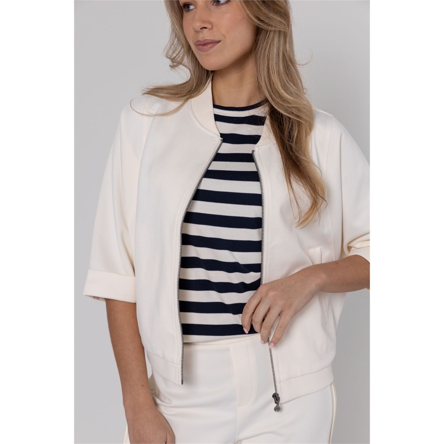 Relaxed and trendy jacket in heavy jersey with bomber collar, zipper closure and 3/4 bat sleeve. Off white: fresh, easy to combine color.