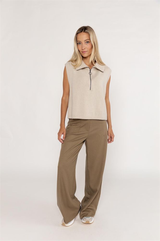 This 100% wool sleeveless sweater is a versatile addition to your wardrobe. The sweater has a high turtleneck with zipper and a boxy fit.