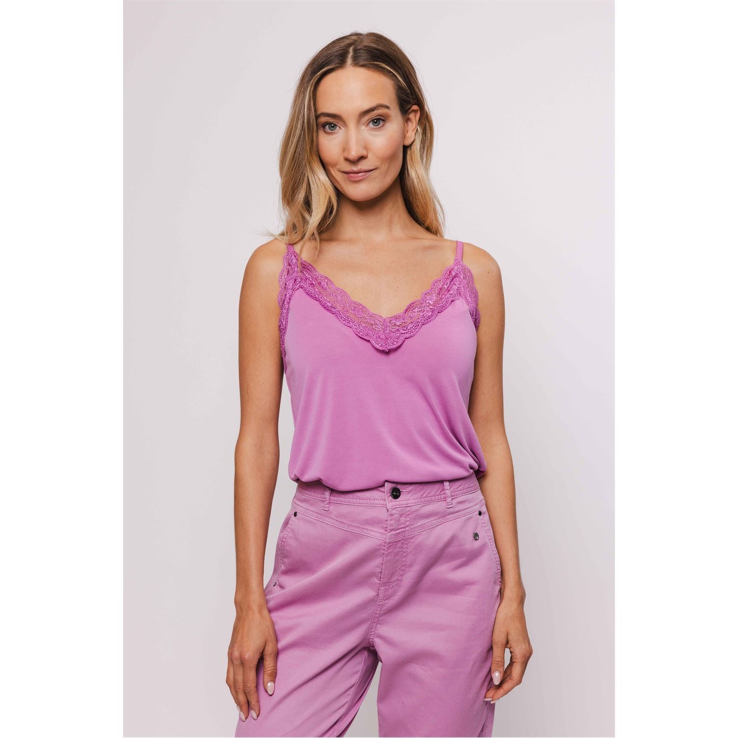 Modal top with adjustable spaghetti straps. The neck and back line are trimmed with lace. A very nice basic that you can combine endlessly.
