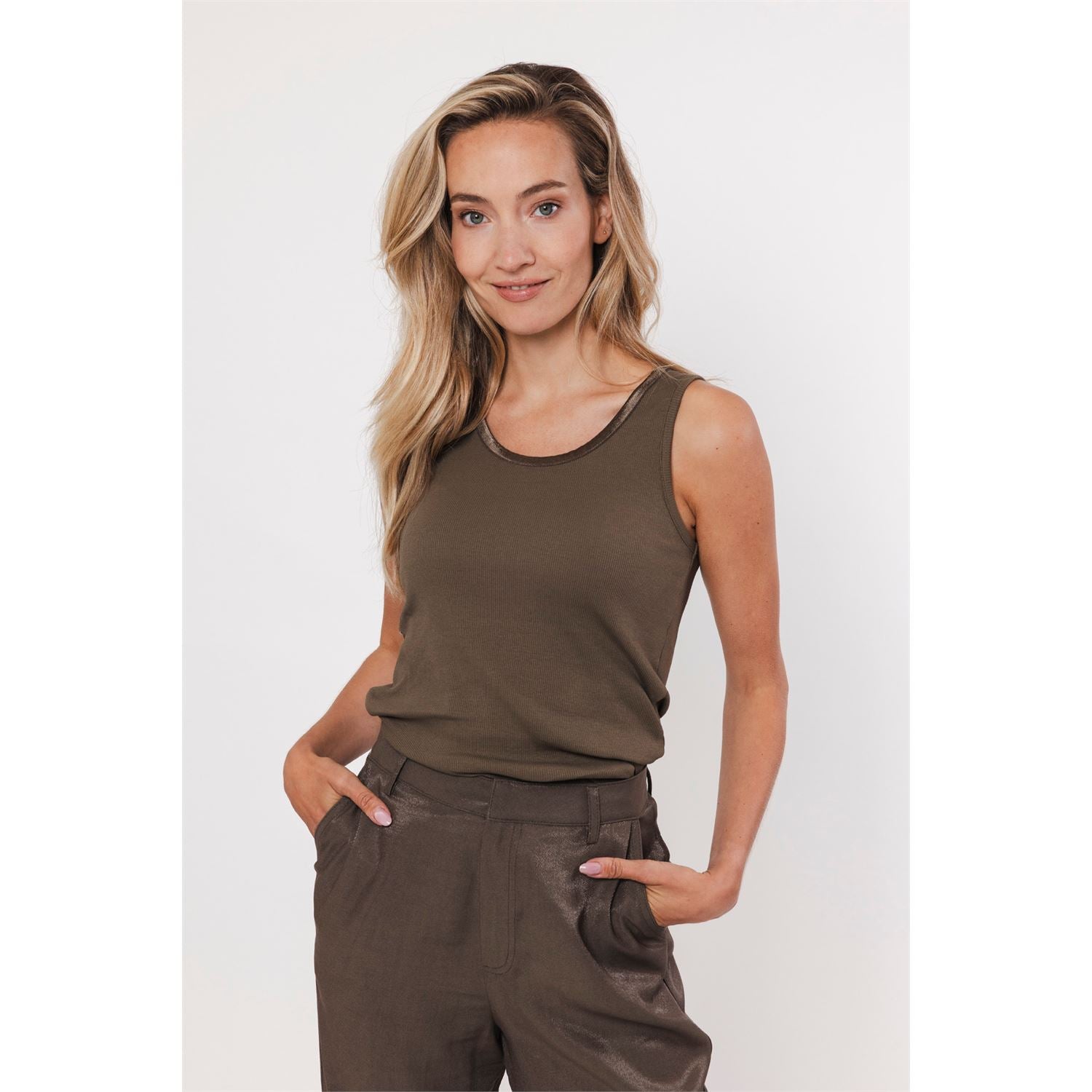 This tank top in cotton rib quality has a round neck with satin finish. The fit is snug. A nice basic with which you can vary endlessly.