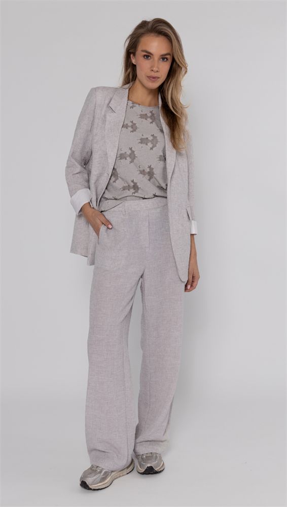 Grijs gemêleerde broek met relaxte pasvorm, rechte pijp, elastische taille en steekzakken. Combineer met onze bijpassende blazer voor een totaal look.