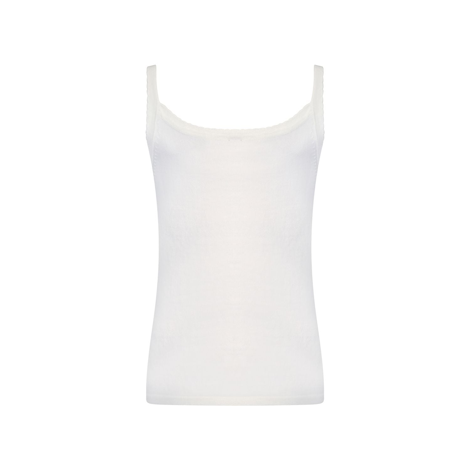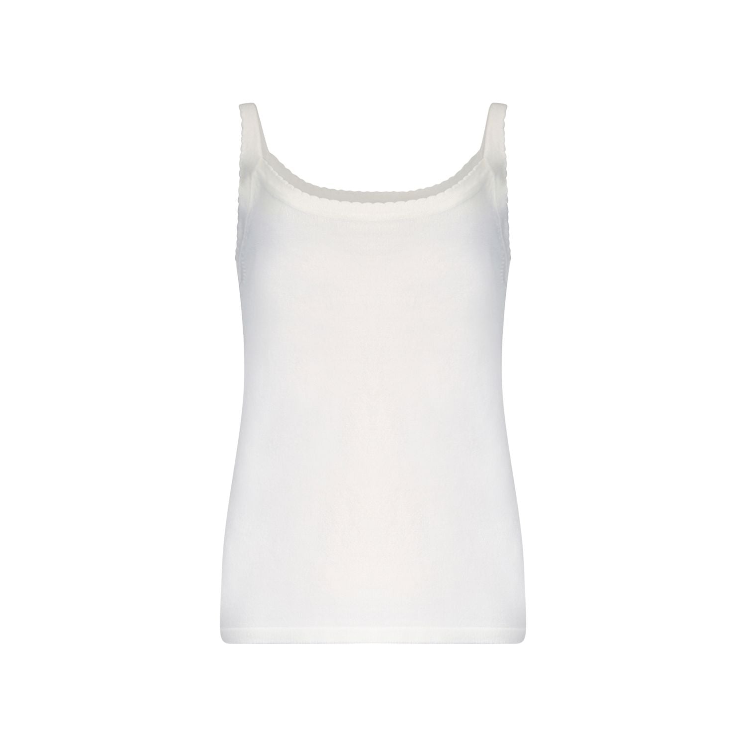 Gebreide viscosemix top met aansluitend model. De golvende afwerking langs halslijn en bandjes geeft een vrouwelijk detail aan deze veelzijdige basic.